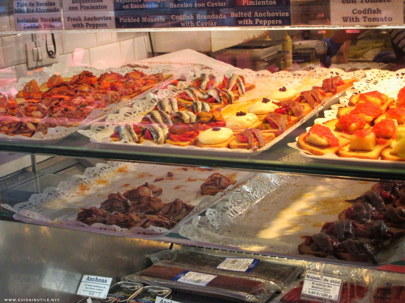 Se cercheremo l’etimologia di “tapa”, scopriremo che una delle storie più diffuse è quella che descrive una leggendaria e antica usanza di coprire (tapar) il bicchiere di vino con una fetta di pane o di prosciutto, per evitare che le mosche vi cadessero dentro. Scopriremo che, come tutte le leggende, la storia fa un po’ a pugni col fatto che la tradizione delle “tapas” si consolida in realtà molto più recentemente, nella Spagna post-Franco. Per quel che mi riguarda: non mi appassiono per i miti gastronomici italiani, figurati per quelli spagnoli. Parafrasando il lontano Andy Luotto de “L’Altra Domenica”, per il me il cibo è solo una questione soggettiva di “bbuono, no-bbuono”. E le “tapas” sono “bbuono”. Punto.