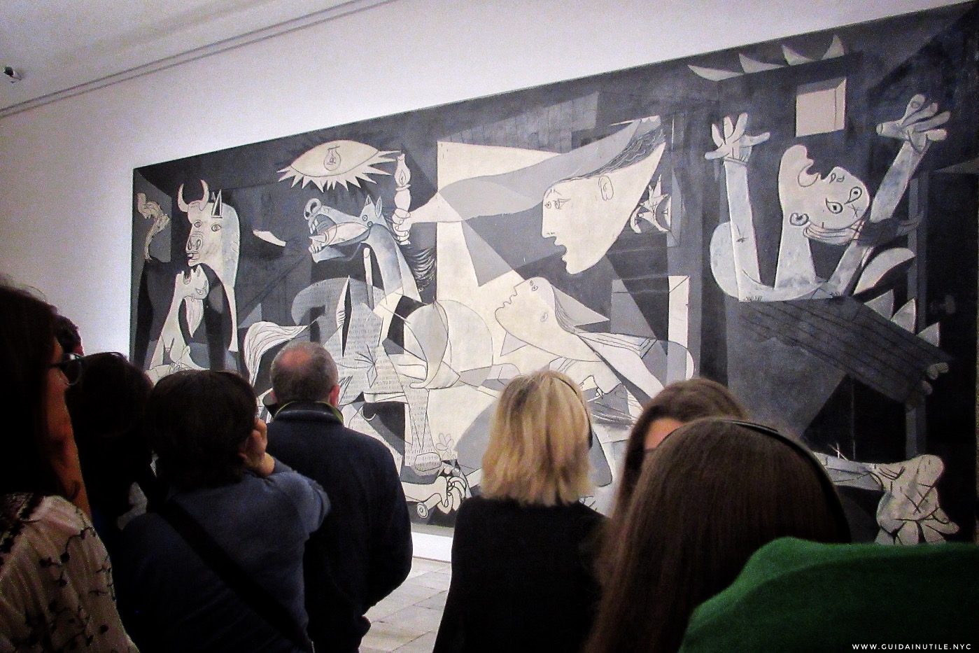 Lavoro infame, quello degli assistenti di sala. In piedi quasi tutto il tempo, spesso davanti ad opere d’arte incomprensibili a loro come ai visitatori. Delle guardie senza potere, questi impiegati, se non quello di sgridarti quando oltrepassi la distanza di sicurezza visibile o invisibile che ti separa dal capolavoro. Hanno tutto la mia stima. Ma io, la foto alla Guernica di Picasso, la faccio lo stesso. Non sono certo arrivato sin quaggiù per tornarmene a casa senza souvenir.